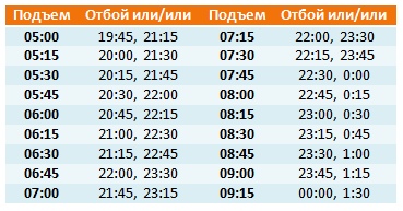 На основе этих знаний создали такую таблицу (правда пришлось ее дополнить, потому что было затруднительно найти информацию о пробуждении к примеру в пять часов утра - все источники, на которые я натыкалась, почему-то представляли информацию только с шести утра):
